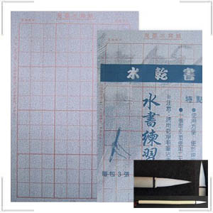 Calligraphy Inkless Practice Sheets with Red Squares • 3 Sheets of Small Calligraphy Inkless Practice Sheets with Red Squares - 10 1/4" Width x 15" Height Plus a large calligraphy brush